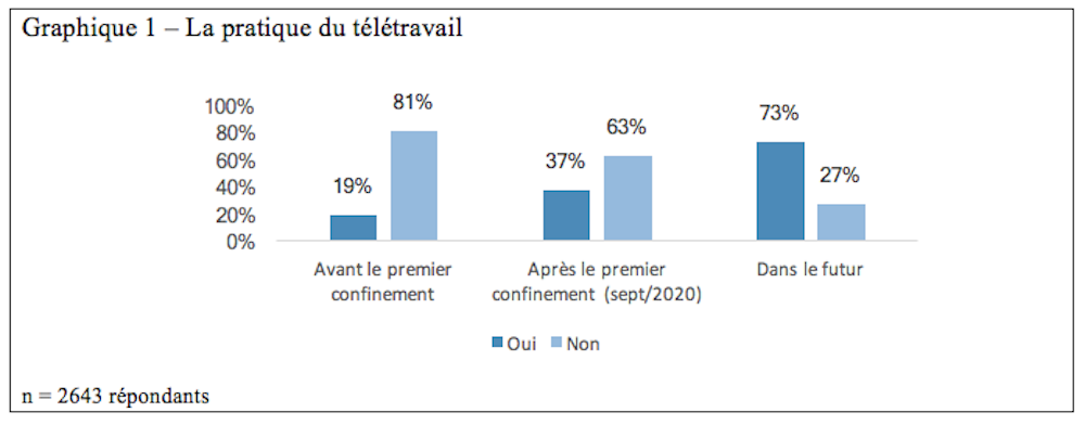 En ce qui concerne les pratiques du télétravail de notre population étudiée et sur la période qui précède le premier confinement du printemps, seulement 19 % de l’ensemble de nos répondants avaient l’habitude de faire du télétravail.