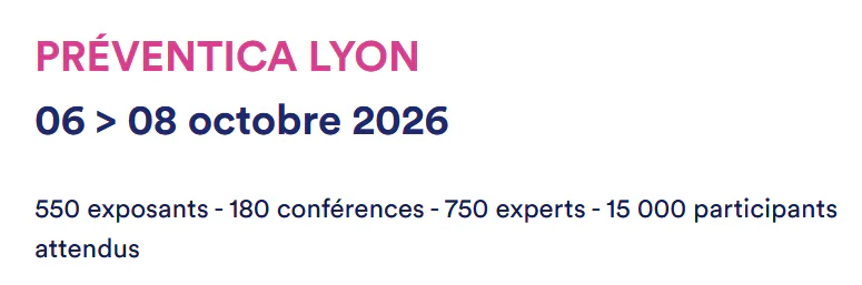 Préventica Lione è il più grande evento francese dedicato alla salute, sicurezza e qualità della vita sul lavoro. Questo salone di tre giorni è il riferimento per tutti gli attori coinvolti nei rischi professionali e nel benessere dei dipendenti, da quasi 25 anni.
